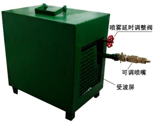 本裝置設(shè)計(jì)為一體化,有進(jìn)水閥門、噴霧時(shí)間調(diào)整閥門等組成,當(dāng)迎頭放炮時(shí)震動(dòng)沖擊波沖擊機(jī)械放炮噴霧裝置的受波屏,進(jìn)水閥門打開,開始噴霧,同時(shí)水源又給進(jìn)水延時(shí)水箱注水,由于延時(shí)水箱與所配墜鐵比重偏移,水箱的水滿后,水箱逐漸傾斜并緩慢放水,從而逐漸減少噴霧延時(shí)時(shí)間,水箱的水流盡后,噴霧停止,直至下一次放炮,再次循環(huán)實(shí)現(xiàn)噴霧過程。噴霧延時(shí)水箱有進(jìn)水調(diào)整閥門,調(diào)整此閥門可調(diào)整噴霧時(shí)間。